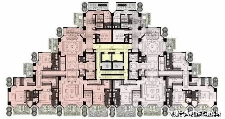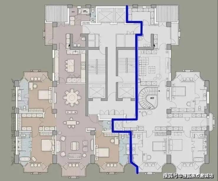 右面是680㎡复式套的一半(单层),相同户型随意构思,并且每户都装备了室内电梯,以及,这个户型上下共有10个阳台!